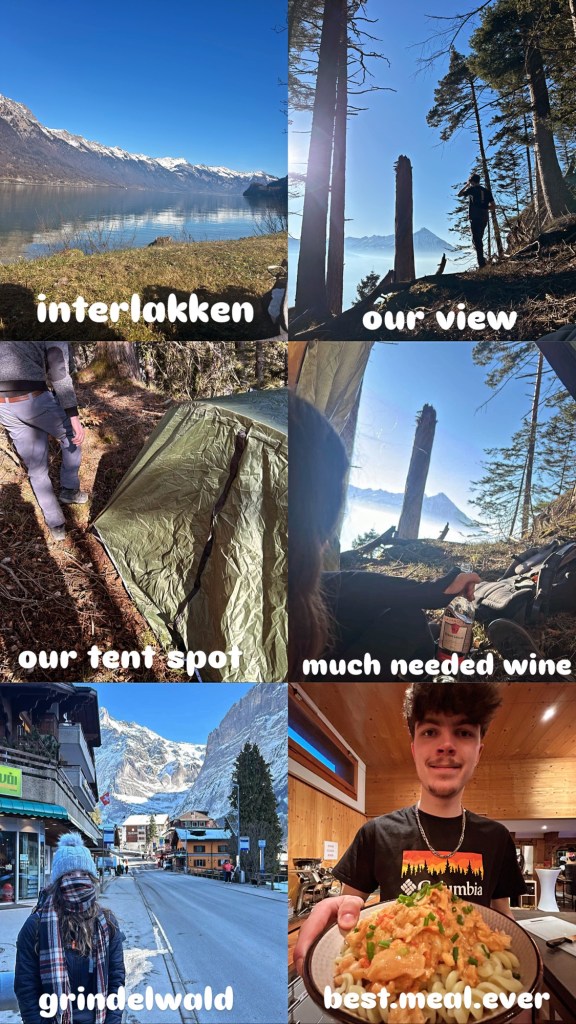 Waking up on the 4th of February, having some proper breakfast, we emptied our bags a little to leave at theirs while we planned on spending a night camping in the beautiful Interlakken. Trains in switzerland were so useful and plentiful so it was no hardship getting there. We spent a while walking around, admiring the scenery, before the search for a place to pitch up.