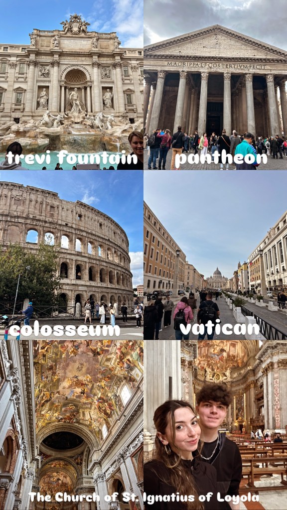 For our final day, we visited the Vatican city, which has a surreal vibe to it and definitely a cool place to visit. We also went to The Church of St. Ignatius of Loyola, which most people know as ‘the one with the mirror’. It was stunning. The artwork in every cathedral amazes me. I can’t even paint a ceiling with a roller never mind a paintbrush for fine details! However, unless you really really want to get that viral mirror photo, I would say queuing up for a few minutes in front of the mirror with everyone watching you, isn’t worth the time. (Life hack: Either bring your own mirror or use someone’s phone and do your own DIY mirror)